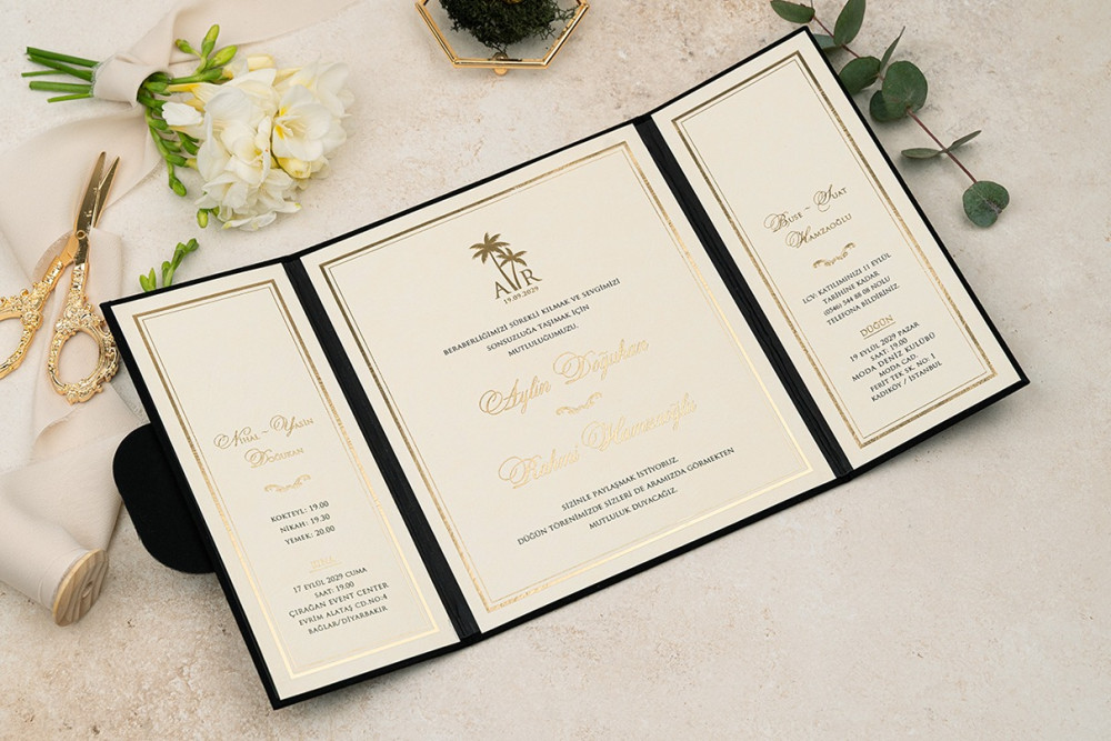 Modül kısmından "davetiye iç baskı" seçeneğini işaretlemek zorunludur! Aksi takdirde davetiyeler boş şekilde gönderilecektirVarak yaldız zorunlu olan davetiyelerde de "Varak Yaldız Baskı" seçeneği zorunludur. Aksi takdirde görseldeki gibi gelmeyecektir. Seçimlerinizi hatalı yapmanız durumunda görüntüdeki görsel gibi gelmeyecektir. Kafanızda soru işareti var ise ödemeniz öncesi bize ulaşın. Zarf isim baskı bazen zorunlu değildir. Resimdeki davetiyede zarfta isim varsa modül kısmından seçiniz.
