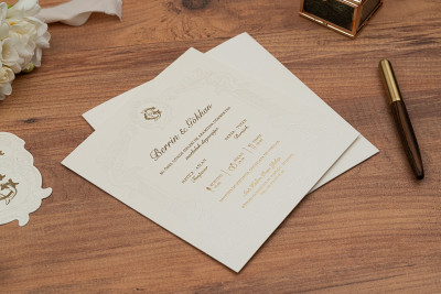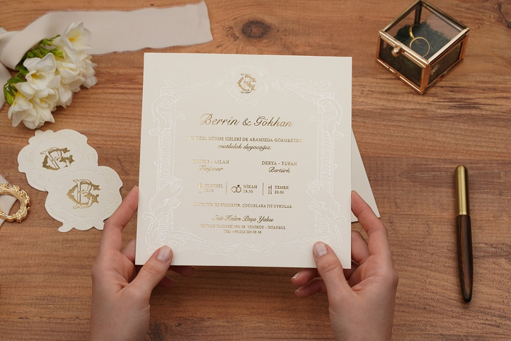Zarfa isim baskı ise, davetiyenin zarfının üstüne gelin damat ismi, baș harfleri veya tarih bilgilerinin basılma ișlemidir. İsteğe bağlıdır.