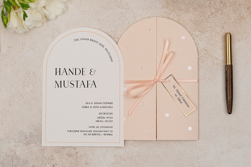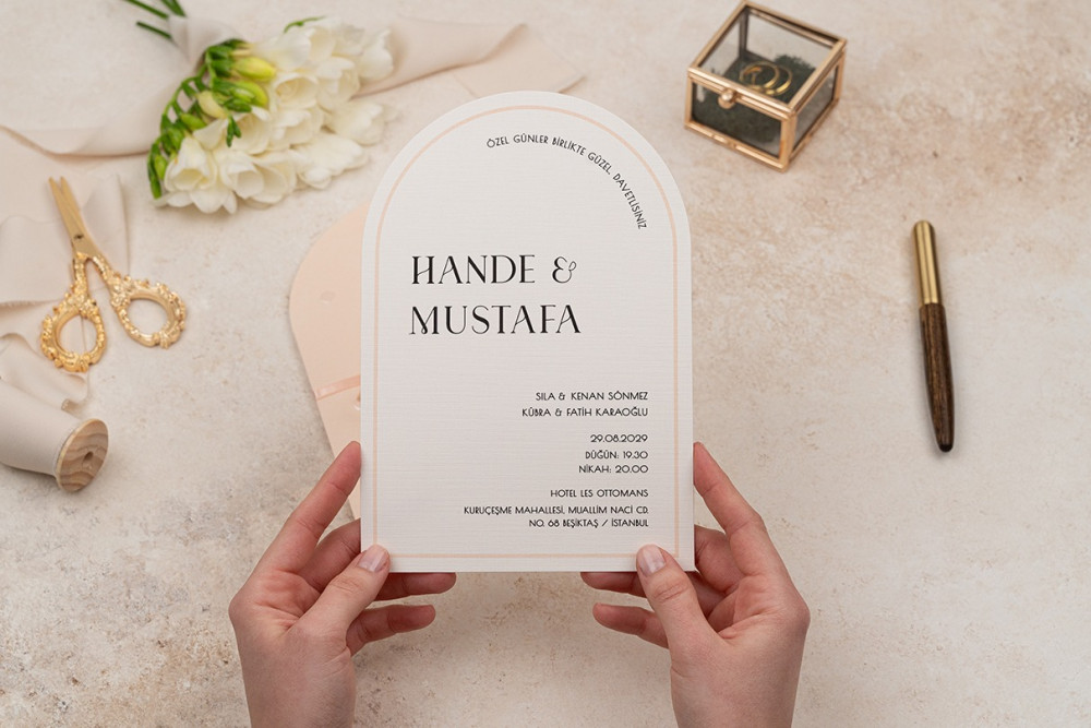 Davetiyeler tarafınıza demonte olarak gönderilir. Katlama/birleştirme, aksesuar takma, zarflama ve kutulama gibi işlem gerektiren davetiyelerde bu işlemler müşteriye ait olup, kolaylıkla yapabileceğiniz şekilde gönderilir. Siparişinizin içine 1 adet örnek hazırlanıp konulacaktır.