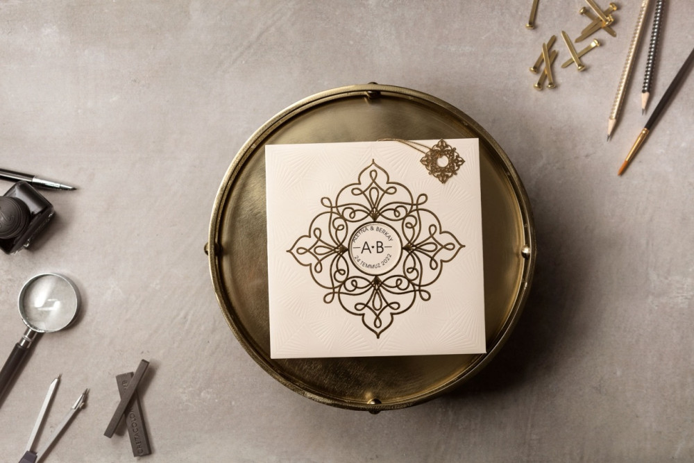 Zarfa isim baskı ise, davetiyenin zarfının üstüne gelin damat ismi, baș harfleri veya tarih bilgilerinin basılma ișlemidir. İsteğe bağlıdır.