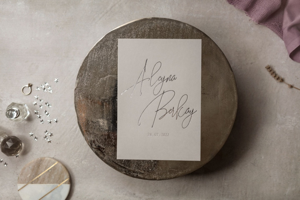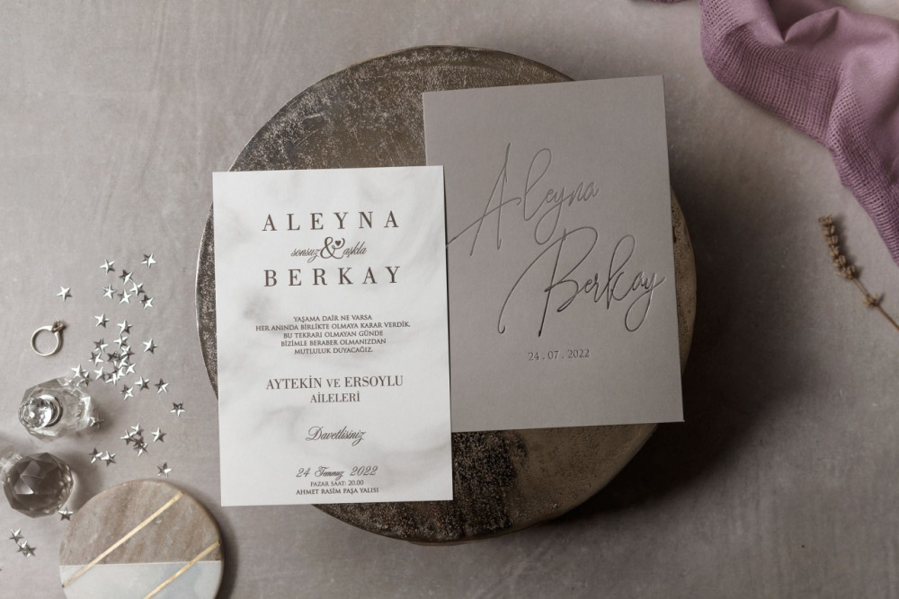 Zarfa isim baskı ise, davetiyenin zarfının üstüne gelin damat ismi, baș harfleri veya tarih bilgilerinin basılma ișlemidir. İsteğe bağlıdır.